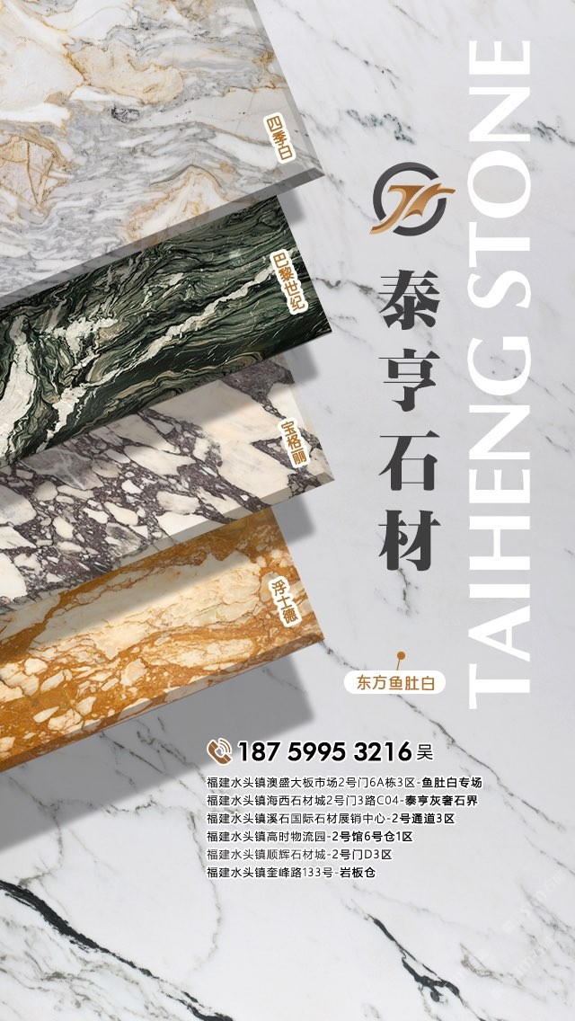 泉州泰亨石材有限公司,辦公地點(diǎn)位于中國石材之都—南安水頭。經(jīng)營產(chǎn)品有:東方魚肚白(自有礦山),四季白,巴黎世紀(jì),寶格麗,浮士德,布達(dá)拉灰(自有礦山),星空灰(自有礦山)、雅蘭云天(包礦)、蘋果灰(包礦)、銀鉆咖啡(包礦)、魚肚白、雪花白、藍(lán)金沙白金沙系列、帕斯高灰、意大利木紋、意大利,西班牙原裝進(jìn)口巖板(中國總代理)、國產(chǎn)巖板(福建總代理)、黃斑石、意大利木紋、銀鉆咖啡,魚肚灰等優(yōu)質(zhì)品種。我們以經(jīng)驗(yàn)豐富的采購團(tuán)隊,熱情專業(yè)的銷售團(tuán)隊和執(zhí)著細(xì)致的技術(shù)團(tuán)隊,為客戶提供精致的產(chǎn)品,售前售后服務(wù)和技術(shù)支持。本著為客戶負(fù)責(zé)的態(tài)度,經(jīng)過多年的潛心經(jīng)營,泰亨石材在石材業(yè)界樹立了良好的信譽(yù)。如果您對我司的產(chǎn)品服務(wù)有興趣,歡迎在線留言或來電來函咨詢,泰亨石材在追求美的路上與您一路同行。