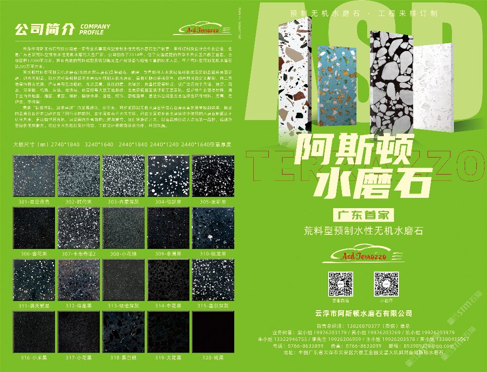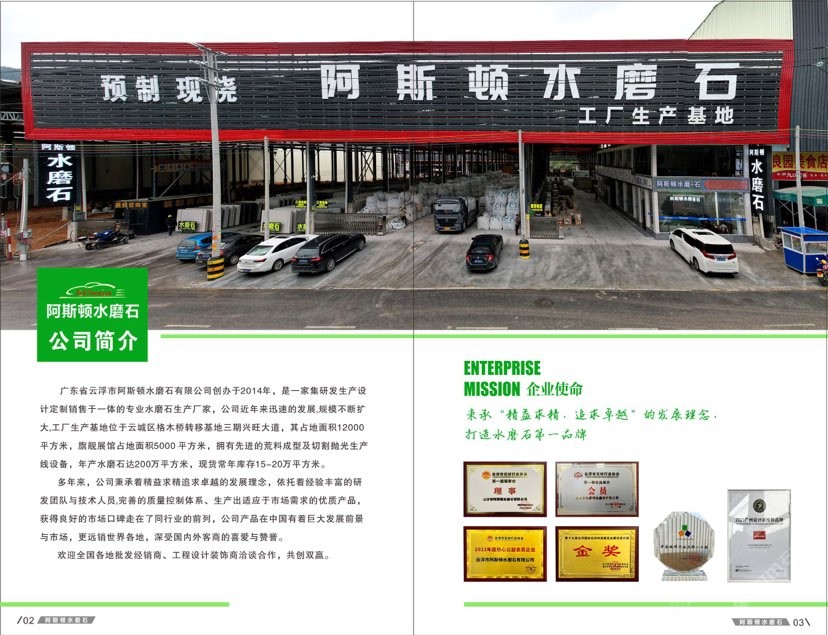 廣東省云浮市阿斯頓水磨石有限公司創(chuàng)辦于2014年,是一家集研發(fā)生產(chǎn)設(shè)計定制銷售于一體的專業(yè)水磨石生產(chǎn)廠家,公司近年來迅速的發(fā)展,規(guī)模不斷擴(kuò)大,工廠生產(chǎn)基地位于云城區(qū)格木橋轉(zhuǎn)移基地三期興旺大道,其占地面積12000平方米,旗艦展館占地面積5000 平方米,擁有先進(jìn)的荒料成型及切割拋光生產(chǎn)線設(shè)備,年產(chǎn)水磨石達(dá)200萬平方米,現(xiàn)貨常年庫存15-20萬平方米。 \\\