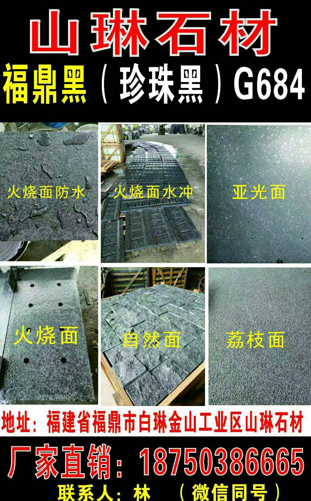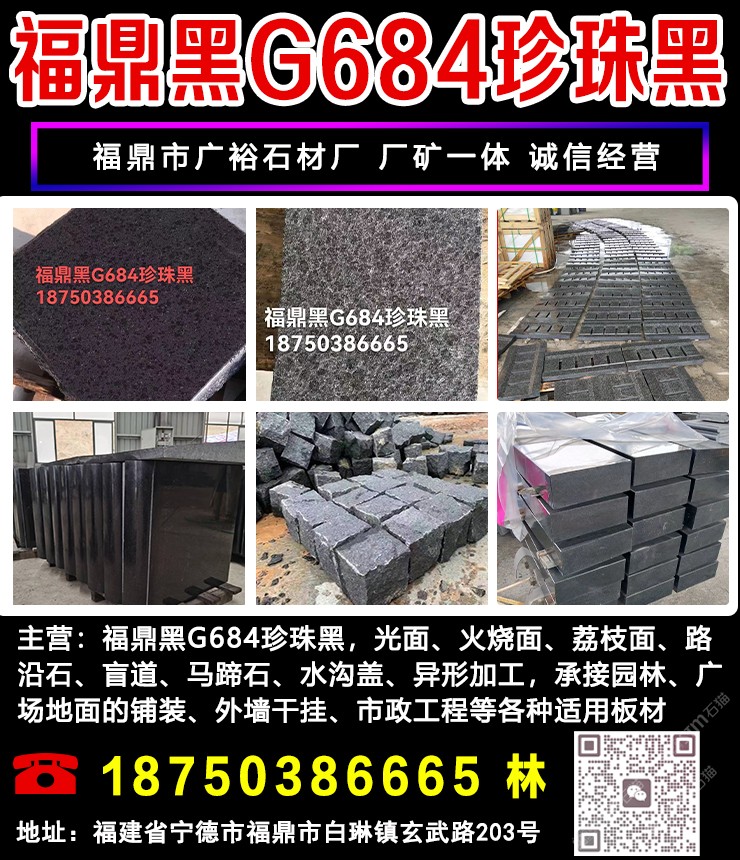 主營:福鼎黑G684、珍珠黑、芝麻黑G654,光面、荔枝面、火燒面、馬蹄石、盲道等。異型加工,承接經(jīng)營:市政園林,廣場(chǎng)地鋪,外墻干掛等各類適用板材