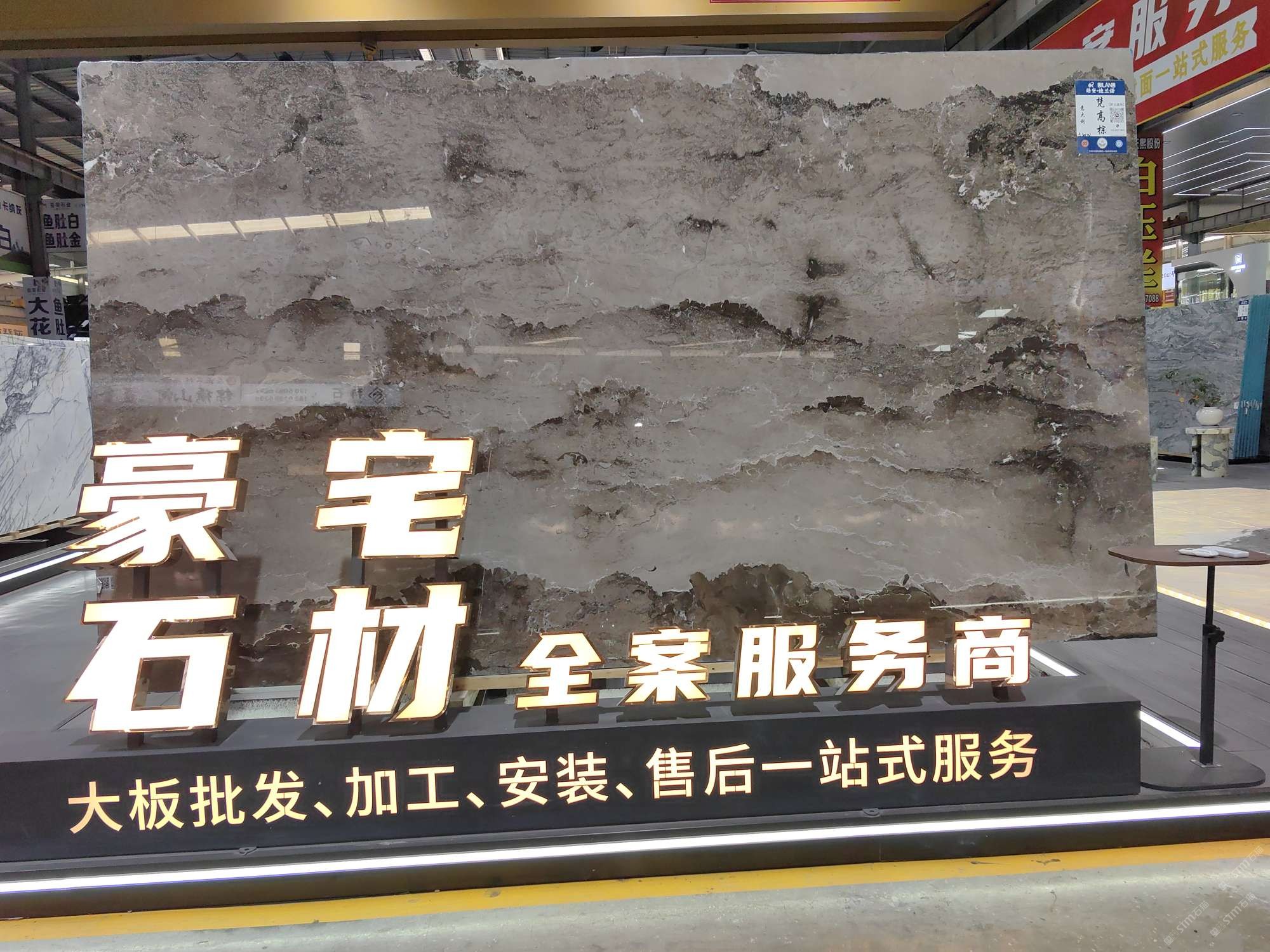 中國福建泉州水頭鎮(zhèn)澳盛大板市5A棟4區(qū)皓安-迪蘭諾輕奢石材全案服務(wù)商選材中心。