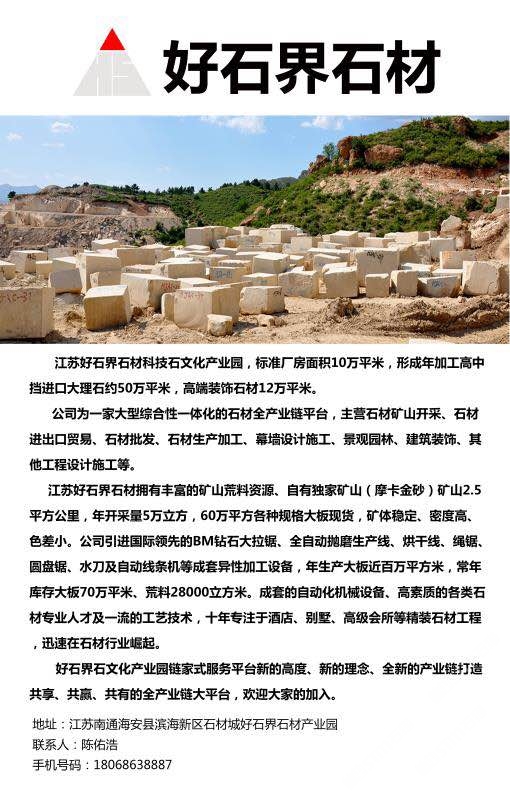 主營范圍: 大板批發(fā)、異型加工、大理石加工、礦山、石材交易市場、