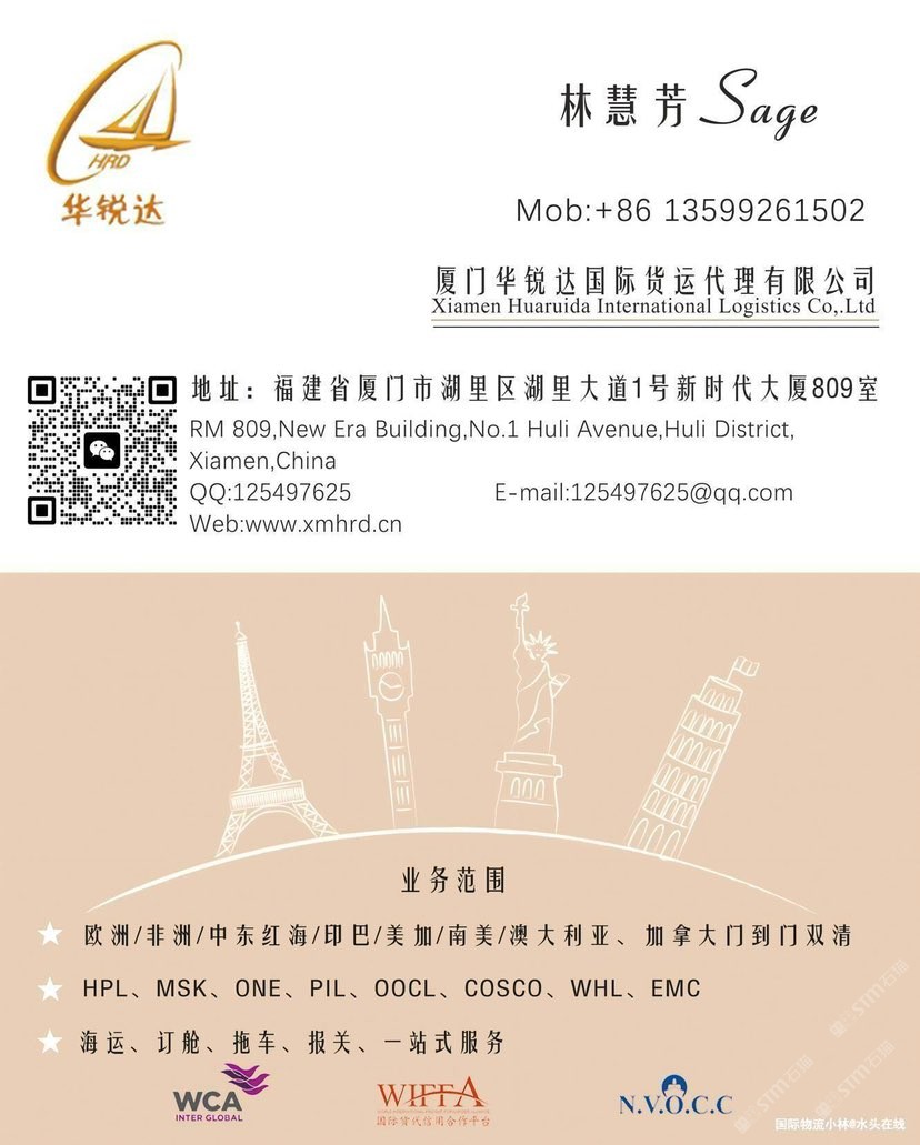 廈門華銳達(dá)國(guó)際物流有限公司 聯(lián)系人:林慧芳    135****1502 查看 135****1502 查看 主營(yíng)范圍: 物流、 企業(yè)地址:福建廈門廈門湖里區(qū)湖里大道1號(hào)新時(shí)代大廈8樓809室