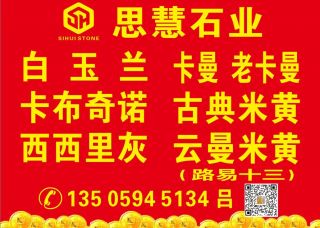 泉州祥樂石業(yè)有限公司主營產(chǎn)品:宇宙米黃,漢瑪米黃,閃電米黃,貴州木紋,嫦娥米黃,香妃玉蘭,黃金米黃,金葉米黃(老礦),皇家金葉,金葉米黃,新莎安娜米黃,奔馳灰,寶馬灰,賓利灰1,格利斯灰,藍至尊(巴西礦),東方白,新水紋銀,奧特曼,云多拉灰,瑪雅灰(愛琴?;摇⑿峦炼浠遥?新奧特曼灰,古堡灰,愛瑪仕灰,灰姑娘,雅仕灰,流星灰,雅士灰,白玉蘭企業(yè)地址:福建南安水頭鎮(zhèn)鴻潤大板市場第二通道B8